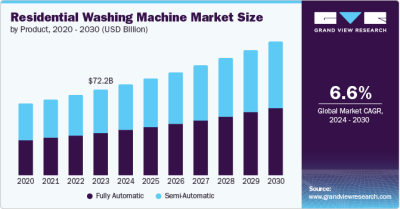 The global residential washing machine market size is expected to reach USD 113.0 billion by 2030, according to a new report by Grand View Research, Inc. It is projected to register a CAGR of 6.6% from 2024 to 2030. Rising standard of living coupled with the rapid urbanization across the globe is expected to drive the growth. Moreover, significant improvement of electricity infrastructure in developing countries including India, Indonesia, and China is expected to further fuel the product demand.