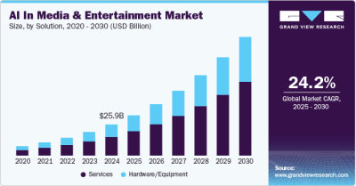 The global AI in media & entertainment market size is expected to reach USD 99.48 billion by 2030, registering a CAGR of 24.2% from 2025 to 2030, according to a new report by Grand View Research, Inc. The increasing popularity of virtual creation in the media & entertainment business, and its ability to create high-definition graphics and real-time virtual worlds, are driving the market forward.