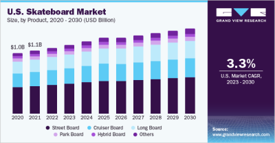 The global skateboard market size is expected to reach USD 4.25 billion by 2030, according to a new report by Grand View Research, Inc. The market is expected to grow at a CAGR of 3.5% from 2023 to 2030. The industry is expected to flourish in the near future due to several factors such as increasing awareness regarding newer sports and inclination toward outdoor sports activities.