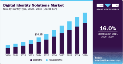 The global digital identity solutions market size is expected to reach USD 98.64 billion by 2030 and is expected to expand at 16.0% CAGR from 2025 to 2030, according to a new report by Grand View Research, Inc. The upsurge in identity-related fraudulent activities, data breaches, and the requirement to abide by various upcoming regulatory frameworks are expected to drive the growth of the market.
