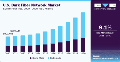The global dark fiber market size is predicted to attain USD 13.45 billion by 2030, according to a new report by Grand View Research, Inc. It is anticipated to progress at a CAGR of 12.8% from 2023 to 2030. Dark fiber has emerged as a sustainable solution for various organizations that are focusing on enhanced communication and network management. Continuously increasing penetration of internet services over the period has paved the way for the high demand for internet bandwidth. This demand is expected to remain rampant over the forecast period. This is the most significant factor responsible for market growth across the globe. The market is strongly supported by companies with a high reliance on internet connectivity. These networks are highly beneficial for organizations with a high volume of data flow in their operation. These benefits include reduced network latency, scalability, reliability, and enhanced security.
