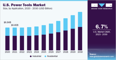 The global power tools market size is anticipated to reach USD 54.39 billion by 2030, expanding at a CAGR of 7.2% from 2023 to 2030, according to a new report by Grand View Research, Inc. Demand for compact, flexible, and mobile tools is increasing in the industrial as well as residential applications. Power instruments play a crucial role in reducing manual efforts, especially in heavy duty applications; this is projected to have a positive impact on the market.