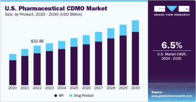 The global pharmaceutical CDMO market size is anticipated to reach USD 235.5 billion by 2030 and it is projected to grow at a CAGR of 7.2% from 2024 to 2030, according to a new report by Grand View Research, Inc. A growing consumption of biopharmaceuticals, rising demand for advanced therapeutics, demand for orphan drug discovery, upsurge number of clinical trials and increasing demand for one-stop-shop CDMOS are anticipated to influence the global market positively.