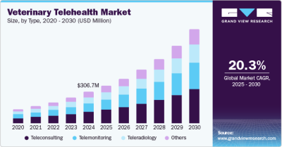 The global veterinary telehealth market size is estimated to reach USD 921.40 million by 2030, registering a CAGR of 20.33% from 2025 to 2030, according to a new report by Grand View Research, Inc. An increase in the adoption of telehealth services among pet owners coupled with the rising prevalence of animal diseases is a key contributor to market growth.