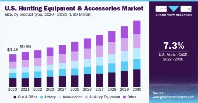 The global hunting equipment & accessories market size is expected to reach USD 38.26 billion by 2030, registering a CAGR of 7.5% over the forecast period, according to a new report by Grand View Research, Inc. These products easy to carry, set up, and wear, which driving drive their demand. In recent years, a key trend that has been observed in the global industry is eco-friendly hunting equipment & accessories. This trend is expected to become largely popular going forward and will help in the further growth of the market. The high price of accessories and limitations on the hunting of any animal in several countries are the key factors that may hamper the growth.
