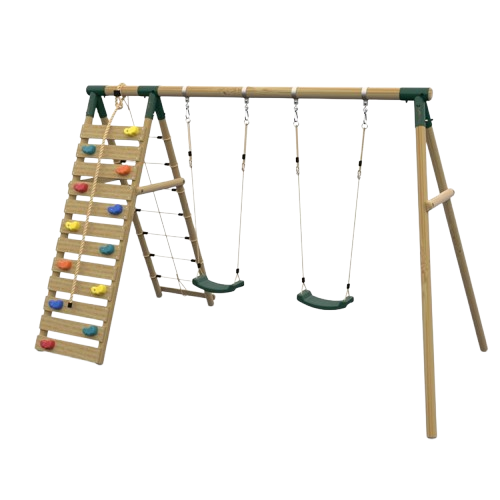 The Tamarin Wooden Swing Set is designed for adventurous children who enjoy physical challenges. Featuring a robust climbing wall alongside a classic swing, this playset delivers an exciting mix of movement and exploration.