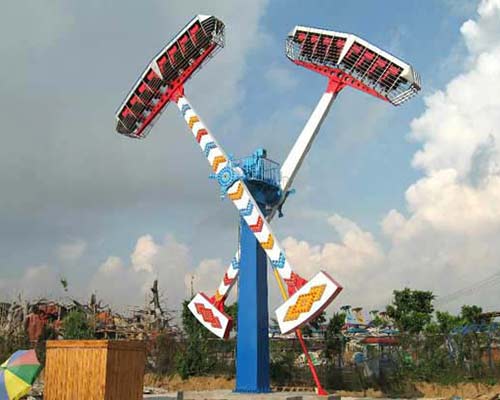 The kamikaze ride is a large amusement park equipment. It is composed of a huge stand column as central support, which with motor upside, one platform and the control system, and two long mechanical rotating arms with a gondola at each end.