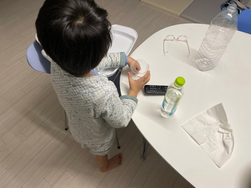 목 마르다며 큰아들 일어났어요.