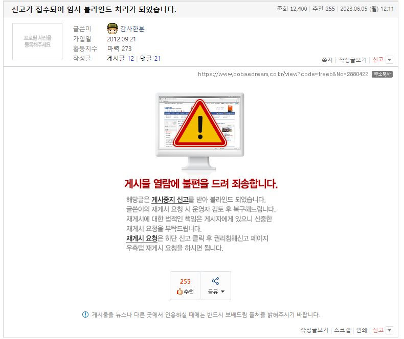 글 블라인드 한다고 하는게 명예훼손이면 그런 짓이나 하지 말아요.