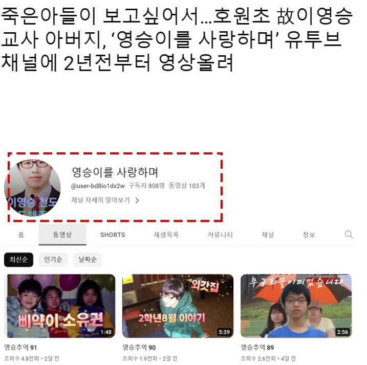 학부모들의 악성 민원에 시달리다 극단적인 선택한 호원초 故이영승 교사의 아버지, 어머니의 슬픔이 고스란히 느껴지는 유튜브 채널이 알려지며 안타까움이 커지고 있다. 해당 채널은 2년전 세상을 떠난 故 이영승 교사의 부모님이 운영하는 것으로 보여진다.