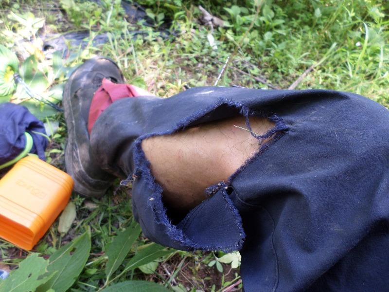 잠깐 쉴때 찢어진 바지를 보니 이래 가지고 산행이 계속 될까 싶었다